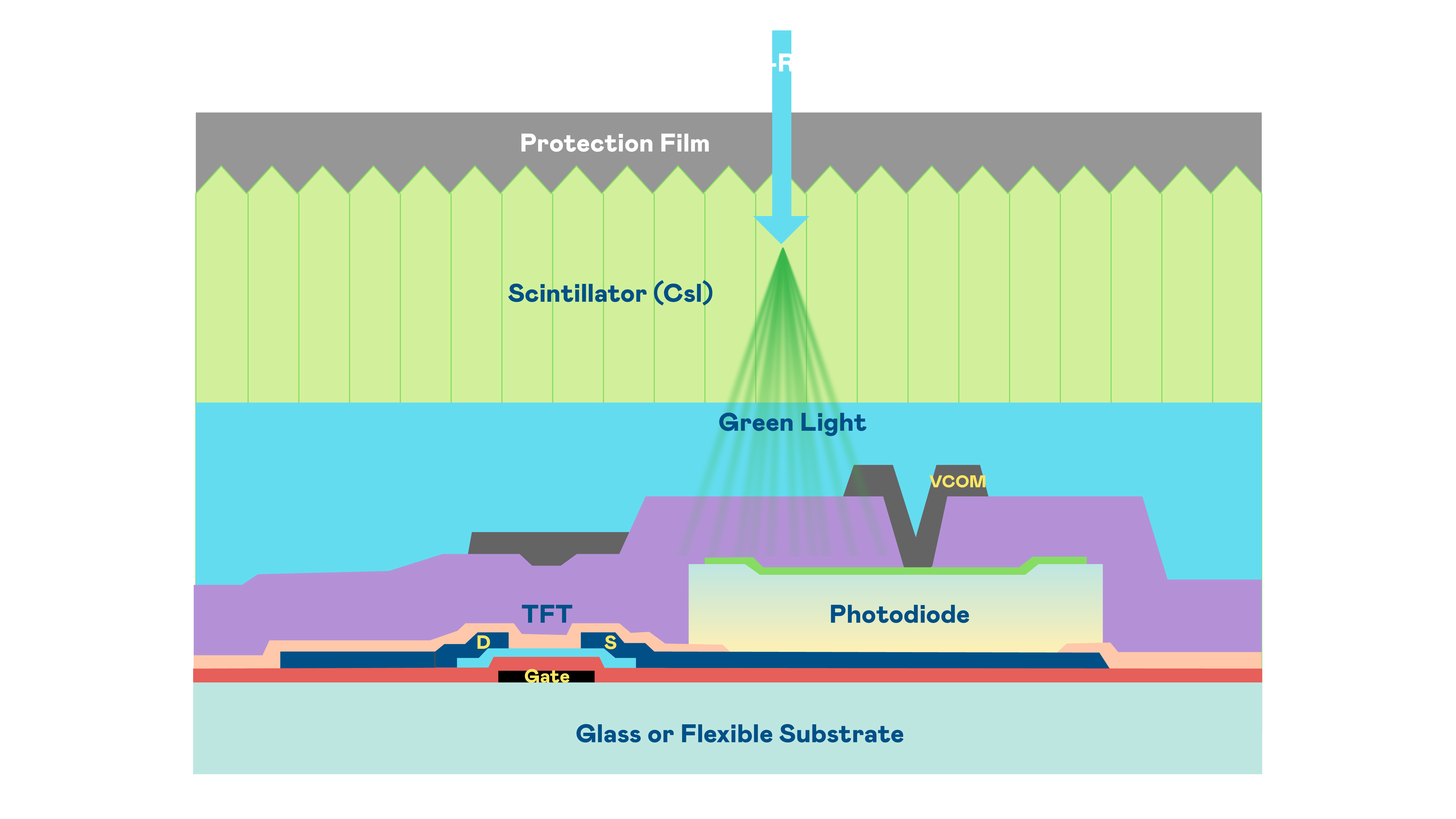 Z6·尊龙时凯的X光影像感測陣列使用薄膜電晶體 (TFT) 作為每個像素的讀取開關,搭配光電二極體(Photodiode)的光電轉換元件,用以感測X光影像訊號。
